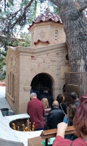 Each year I collected names to take to Saint Nektarios for the nuns to offer in intercession, and I’d also collect money from the congregation. Finally it was over 2000 names and 300 Euro. The little widow * who guarded the chapel would see me, get a big smile and cry “Amerikanós! 𝐴𝑚𝑒𝑟𝑖𝑘𝑎𝑛ó𝑠!” She even let me take pictures where it was not allowed. Devotion to the blessed saint was growing back home at Saint Nicholas Church. We now have a large icon of him, with candles burning before him. I decided maybe that was Saint Nektarios’ purpose in going after me. So on the next two trips I said to him: “Please, no more tricks. You’ve got my attention now, for whatever reason.”